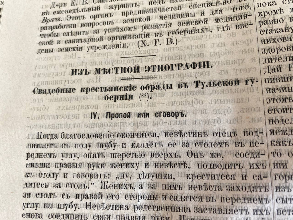 Как рассказывает сотрудник архива, с принятием христианства на Руси в X веке семейные отношения регламентировались церковью. Обязательным атрибутом дореволюционной свадьбы был обряд венчания. Этому есть подтверждение и в архивных документах, и в дореволюционных тульских газетах. Так на страницах «Тульских губернских ведомостей» публиковались статьи, содержащие описания крестьянских свадебных обычаев и обрядов.