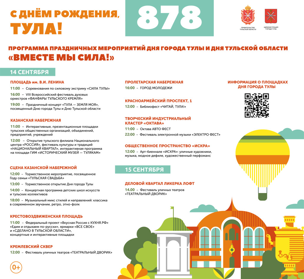 В субботу, 14 сентября, состоится празднование Дня города-героя Тулы и Дня области, приуроченных к Году семьи. Для туляков и гостей города запланированы мероприятия на Казанской набережной, площади Ленина, Крестовоздвиженской площади, улице Металлистов и в других общественных пространствах.
