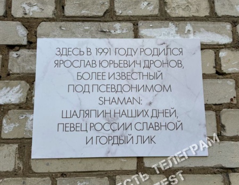 На табличке написано: «Здесь в 1991 году родился Ярослав Юрьевич Дронов, более известный под псевдонимом SHAMAN: Шаляпин наших дней, певец России славной и гордый лик».
