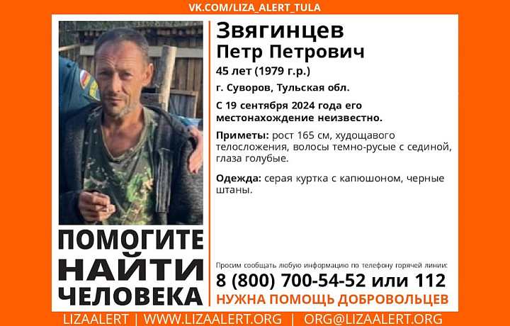 В Тульской области пропал 45-летний житель Суворова Звягинцев Петр Петрович, сообщает региональный поисково-спасательный отряд «ЛизаАлерт».