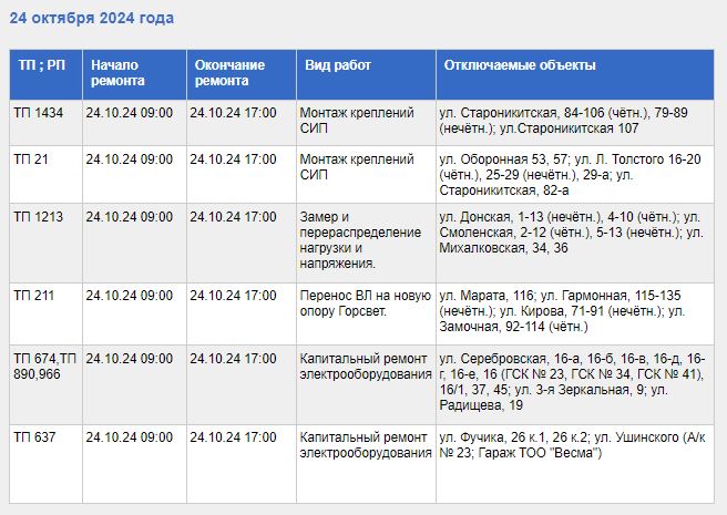 С полным списком адресов, попадающих под плановое отключение света в четверг, 24 октября, можно ознакомиться в таблице ТГЭС, приведенной ниже.