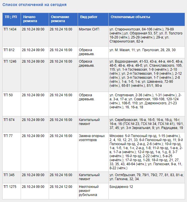 С полным списком адресов, попадающих под плановое отключение света в понедельник, 28 октября, можно ознакомиться в таблице ТГЭС, приведенной ниже.