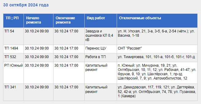 С полным списком адресов, попадающих под плановое отключение света в среду, 30 октября, можно ознакомиться в таблице ТГЭС, приведенной ниже.
