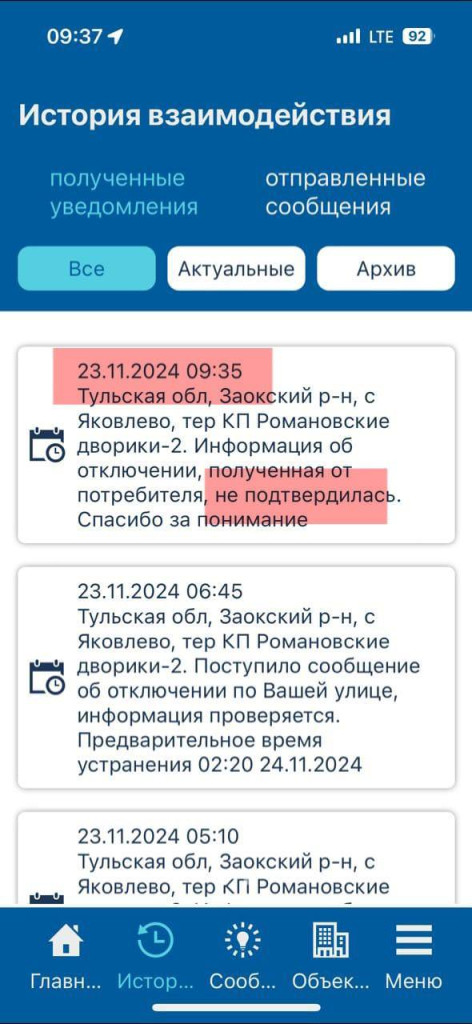 «С вечера 21 ноября мы без электричества, также нет воды. Россети отклоняют наши многочисленные заявки по причине, якобы не подтверждения информации, бригад нет», — пожаловались туляки.
