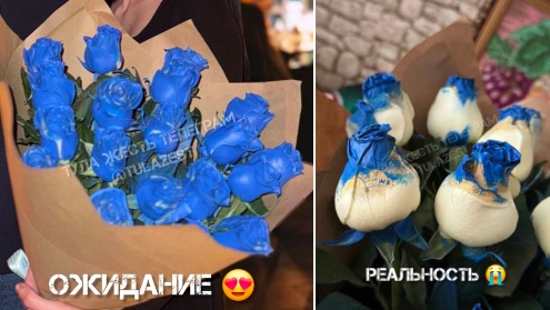 Отметим, что флористы действительно могут красить цветы, чтобы придать им необычный окрас, однако розы должны быть свежими.«Муж на день рождения заказал мне букет синих роз в магазине «Цветков». Там пообещали, что есть синие розы в наличии. Они просто взяли и покрасили гнилые розы краской», — пишет тулячка.