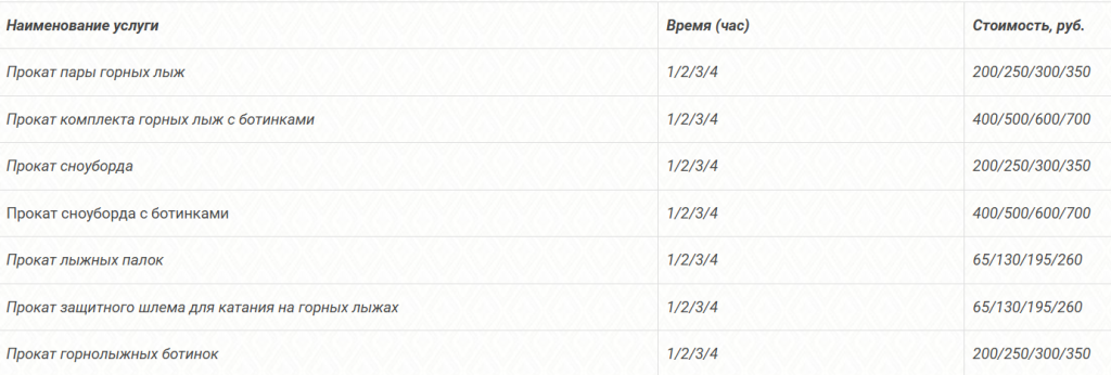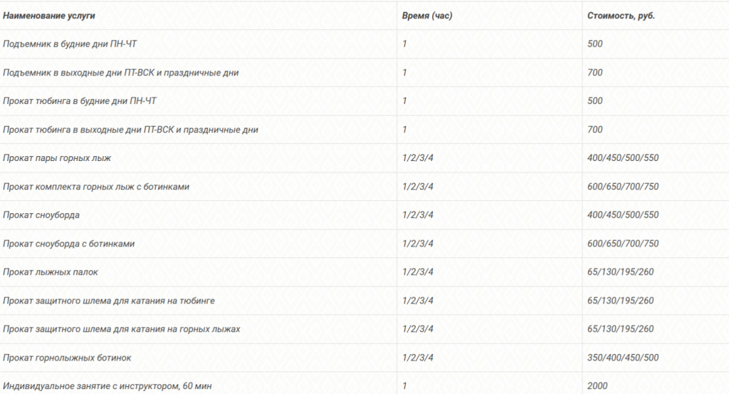 • Оплатить можно прокат снаряжения и без подъемника. Для посетителей любого возраста, такая услуга будет стоить 800 рублей за час, 900 рублей — за два часа и 1 000 рублей за три часа.