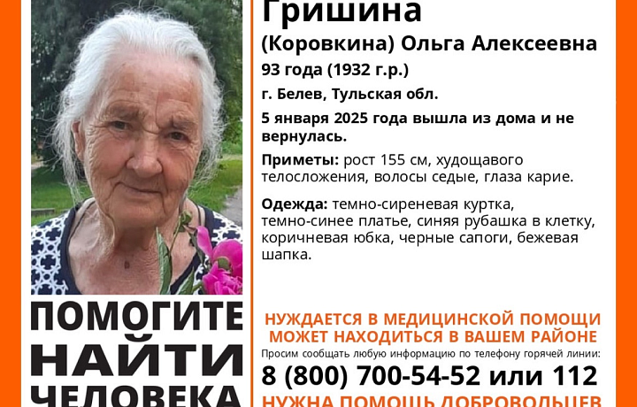 В Тульской области больше трех недель ведется поиск пропавшей 93-летней Ольги Гришиной (Коровкиной), живущей в Белеве. Информация об этом опубликована в сообществе регионального поискового отряда «ЛизаАлерт».