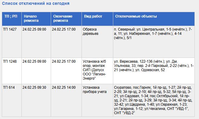 С полным списком адресов, попадающих под плановое отключение света в понедельник, 24 февраля, можно ознакомиться в таблице ТГЭС, приведенной ниже.