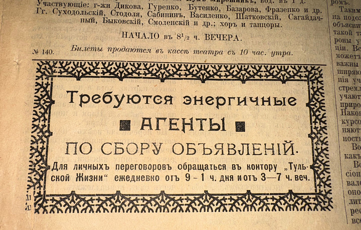 «Самой популярной и востребованной газетой стала "Тульская молва", но прежде чем это произошло, она прошла несколько этапов становления. «Газетчики» перестали пассивно ждать рекламодателя, за него боролись и упорно искали. Набирали "энергичных агентов". Они должны были общаться с потенциальными клиентами и привлекать их в контору. Поэтому появилось много объявлений о том, что требуются агенты по сбору объявлений. Интересно, что в 1902 году в Одессе начало издаваться профессиональное издание, которое публиковало новости рекламного дела: статьи о теории и практике рекламы. Профессия пиар-агента возникла еще в начале 20 века. Это не современное изобретение», — подчеркивает специалист.