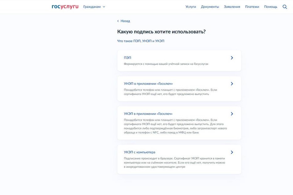 После этого нужно выбрать тип электронной подписи, с помощью которой будет подписано заявление. Существует несколько вариантов: