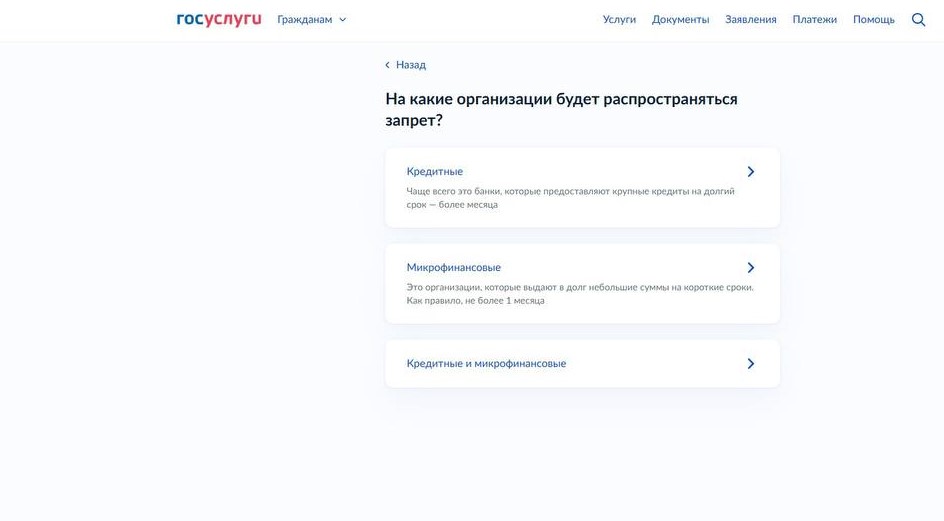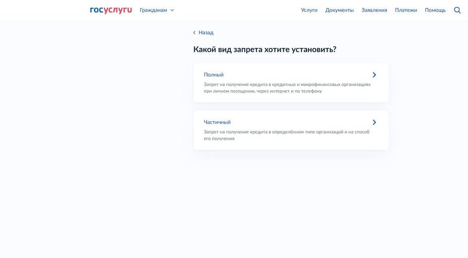 Полный – охватывает получение кредита как в банках, так и в микрофинансовых организациях, включая личные визиты, онлайн-заявки и телефонные обращения. При оформлении частичного запрета необходимо указать тип организации и способ получения кредита.