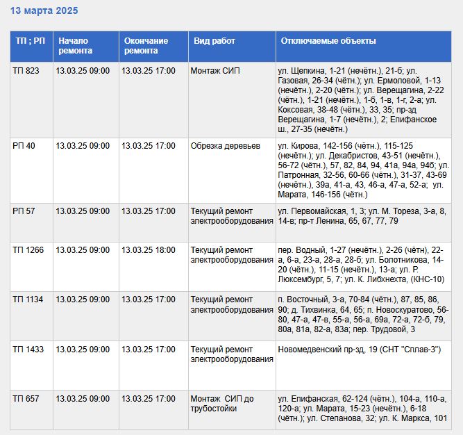 С полным списком адресов, попадающих под плановое отключение света 13 марта, а также с видами проводимых работ, можно ознакомиться в таблице, приведенной ниже.