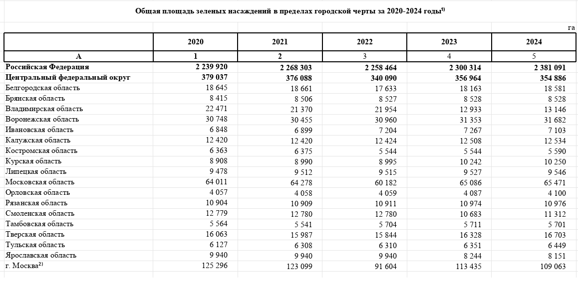 Наименее зеленые регионы ЦФО в городской черте – Тамбовская область (5 701 га), Орловская (4 100 га), Костромская (5 590 га).
