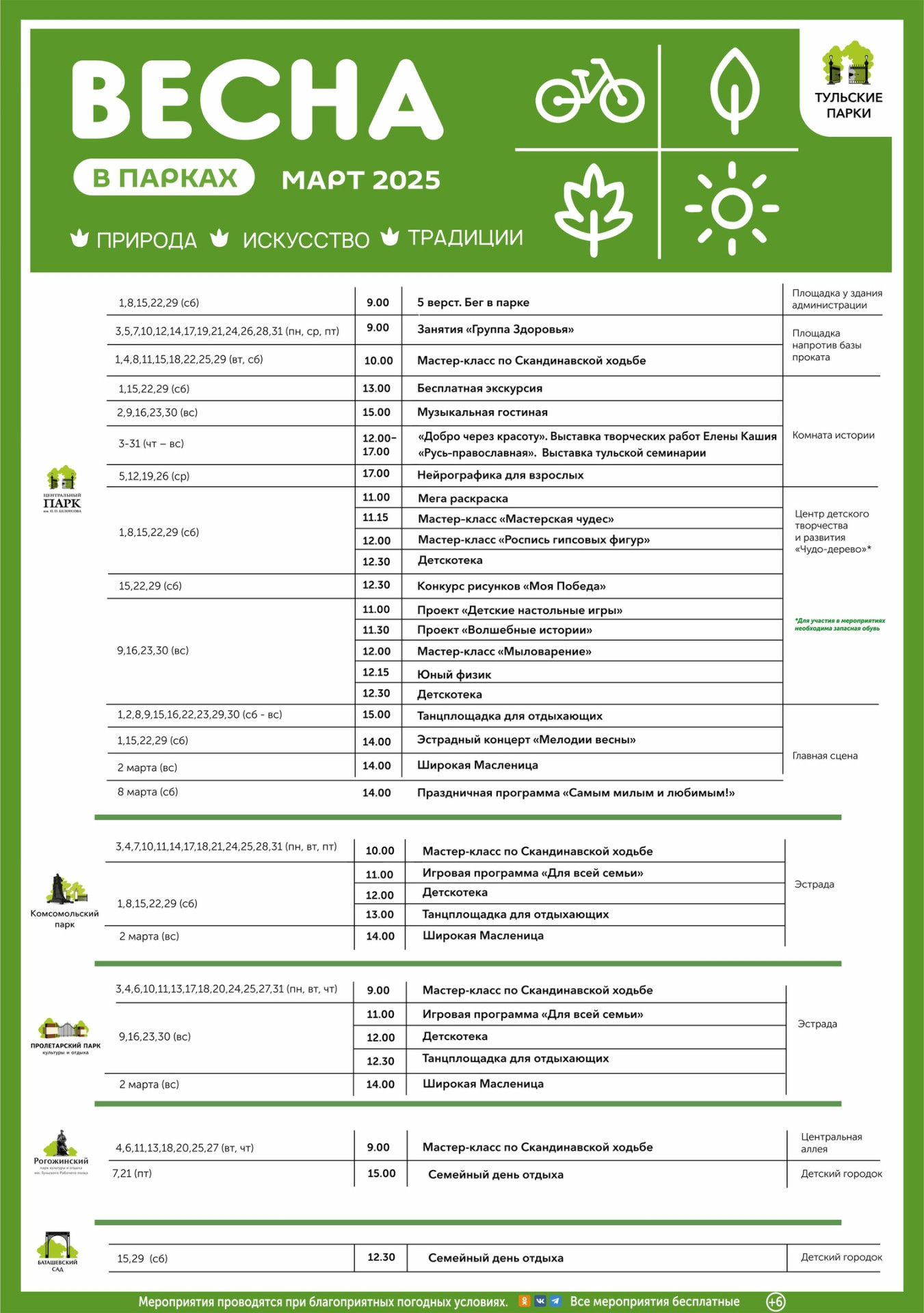 Спортивные и культурные мероприятия ждут в марте в тульских парках. Подробнее – в афише. 18+