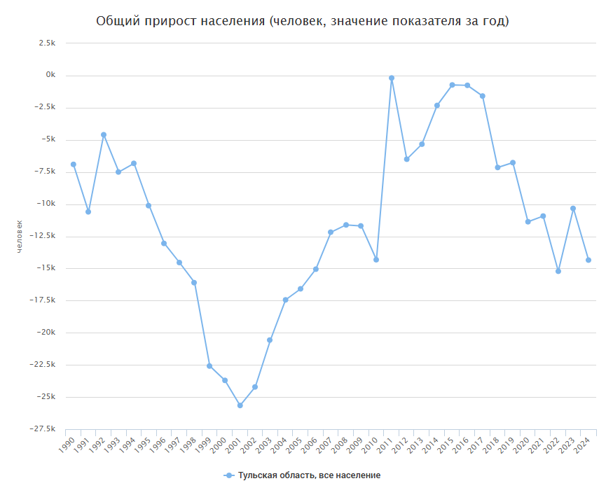 На сайте госстатистики опубликовали данные об общем приросте населения России и субъектов страны, начиная с 1990 года. Так, в Тульской области в течение последних 35 лет ни разу не фиксировали прирост населения.
