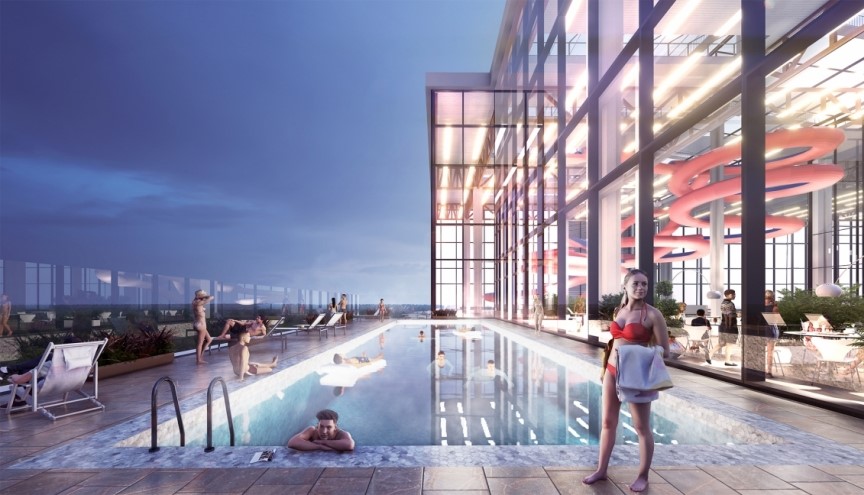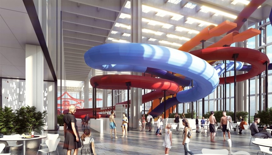 По данным Myslo, аквапарк будет десятиэтажным, с 14 лифтами и эскалаторами. Общая площадь культурно-развлекательного центра составит более 76 тысяч квадратных метров, девять тысяч из них займет сам аквапарк. Также проектом предусмотрена открытая терраса с бассейном площадью 378 квадратных метров. Сам аквапарк будет находиться на верхних этажах здания.