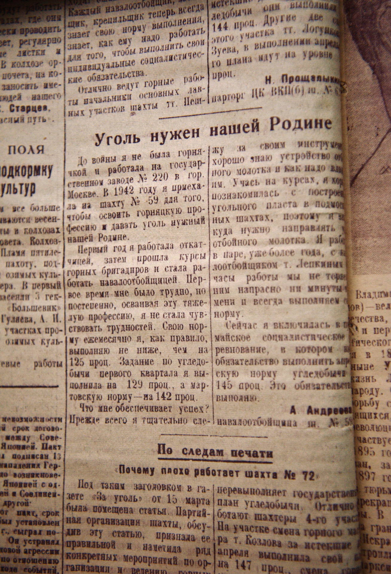 «До войны я не была горнячкой и работала на государственном заводе №220 в гор. Москве. В 1942 году я приехала на шахту №59 для того, чтобы освоить горняцкую профессию и давать уголь, нужный нашей Родине.Первый год я работала откатчицей, затем прошла курсы горных бригадиров и стала работать навалоотбойщицей. Первое время мне было трудно, но постепенно, осваивая эту тяжелую профессию, я не стала чувствовать трудностей. Свою норму ежемесячно я, как правило, выполняю не ниже, чем на 125 проц. Задание по угледобыче первого квартала я выполнила на 129 проц., а мартовскую норму – на 142 проц.», – говорится об успехах горнячки в газете.