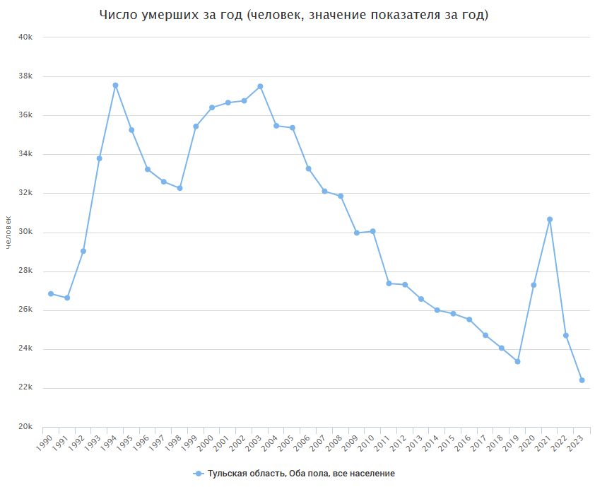 Пиковые показатели по смертности были зафиксированы в регионе в 1994 и 2003 годах – 37 с половиной тысяч человек. После 2010-го смертность стала снижаться, исключением стало «ковидное» время – 30 660 жителей региона скончались в 2021 году.