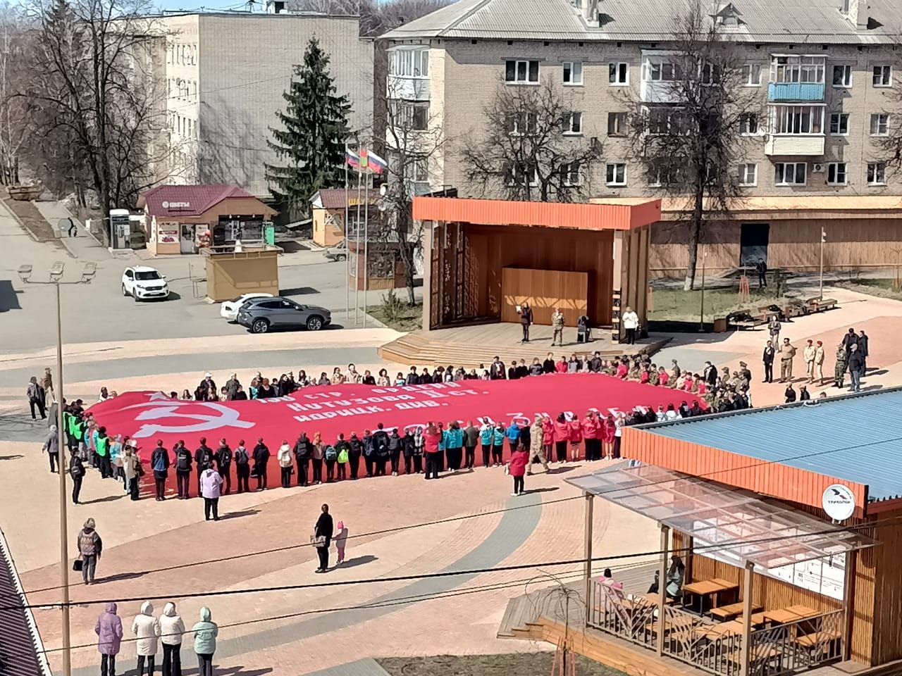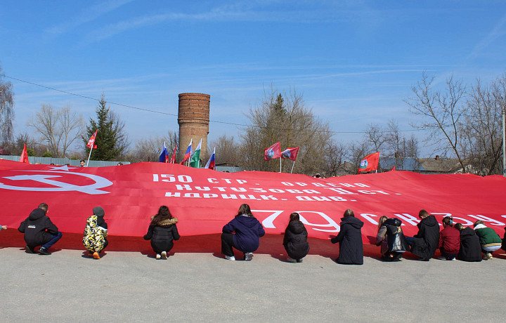 В Тульской области продолжается военно-патриотическая акция «Равнение на Знамя Победы!». 14 апреля копию Знамени Победы в 200 квадратных метров развернули в поселке Мордвес Веневского района.