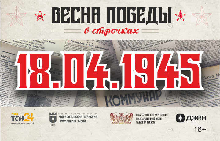 Переместиться на 80 лет назад с помощью старых газет и окунуться в статьи, наполненные предвкушением скорого наступления мира – цель проекта «Весна Победы в строчках». Тульская служба новостей совместно с «Дзен» и Государственным архивом Тульской области, в партнерстве с ПАО «Императорский Тульский оружейный завод» продолжает рассказывать о том, что писали в региональных газетах за месяц до Победы в Великой Отечественной войне – с 9 апреля по 9 мая 1945 года. Здесь и большие подвиги Красной Армии, меняющие ход истории, и трудовые достижения тружеников тыла, и жизнь обычных людей, на долю которых выпала война.
