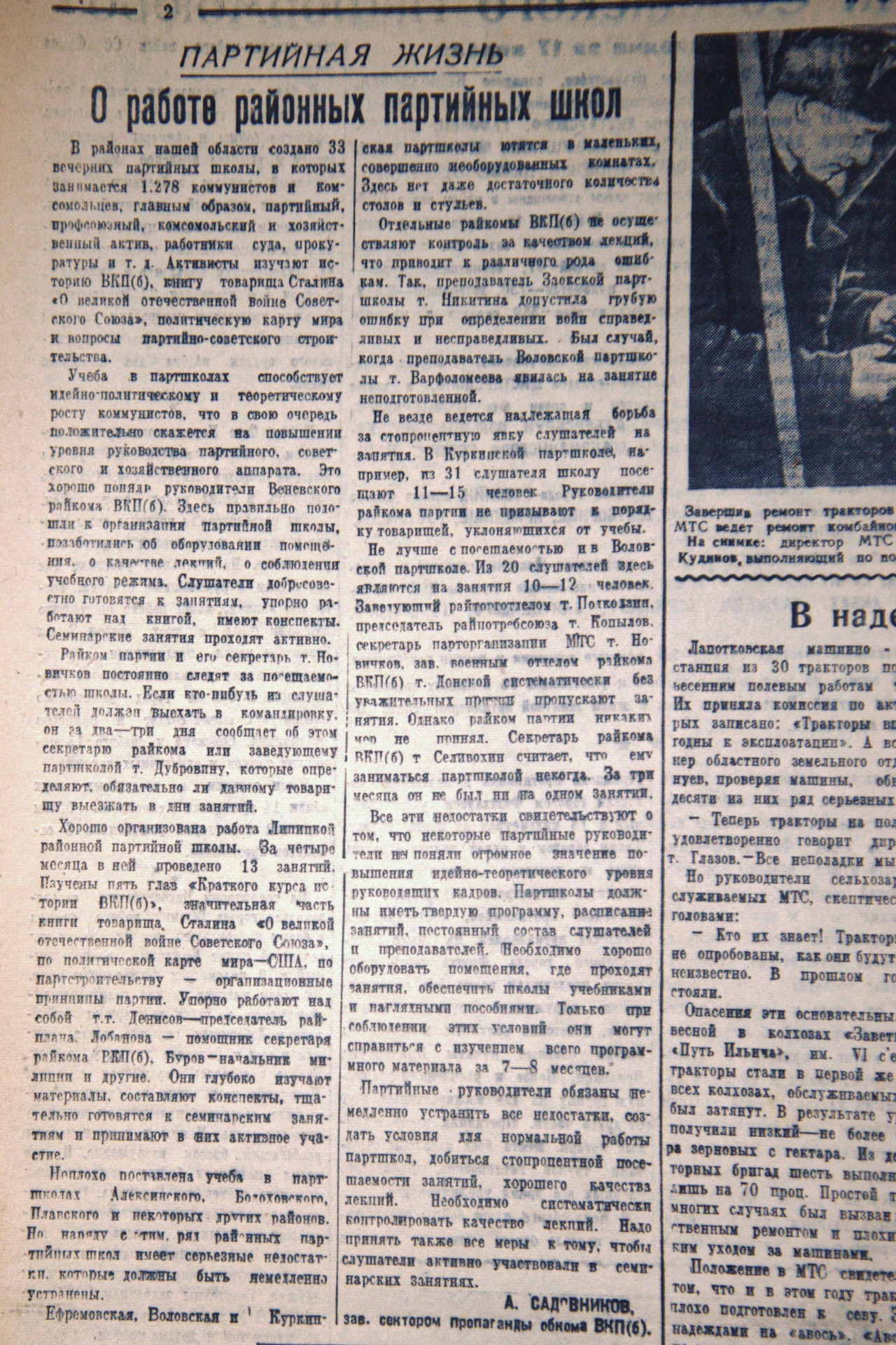 Большое значение в укреплении страны в такое непростое время имеет подготовка партийных работников – этой задачей занимались специальные школы. В статье «О работе районный партийный школ» в том же номере газеты «Коммунар» не только показываются заслуги таких образовательных учреждений, но и порицается работа некоторых руководителей райкома. Так, в «черный список» попали партшколы в Куркинском и Воловском районах региона.