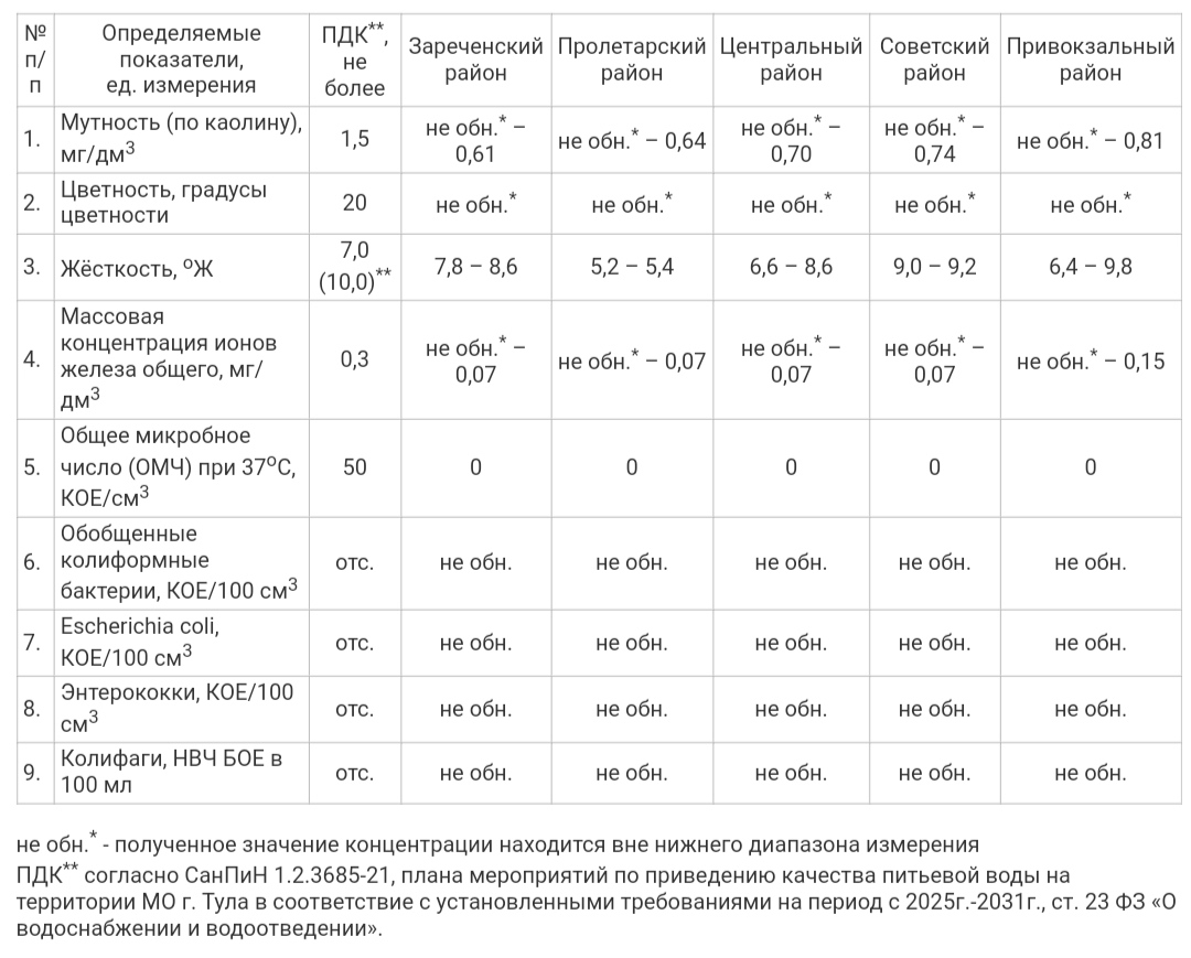 21 апреля АО «Тулагорводоканал» обновил данные о качестве питьевой воды в пяти городских округах.