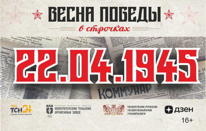 Тульская служба новостей совместно с «Дзен» и Государственным архивом Тульской области в партнерстве с ПАО «Императорский Тульский оружейный завод» продолжает проект «Весна Победы в строчках», рассказывающий о том, что писали в региональных газетах за месяц до победы над фашистской Германией – с 9 апреля по 9 мая 1945 года. На пожелтевших от времени страницах можно найти материалы о том, как жили фронт, тыл и мирные люди в то время.