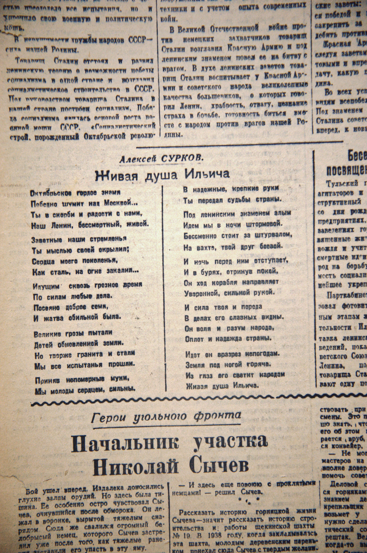 22 апреля отмечается день рождения великого вождя пролетариата – Владимира Ильича Ленина. По этому случаю в том же номере газеты «Коммунар» опубликовано чувственное стихотворение «Живая душа Ильича», посвященное этой личности, оказавшей большой влияние на советского человека.