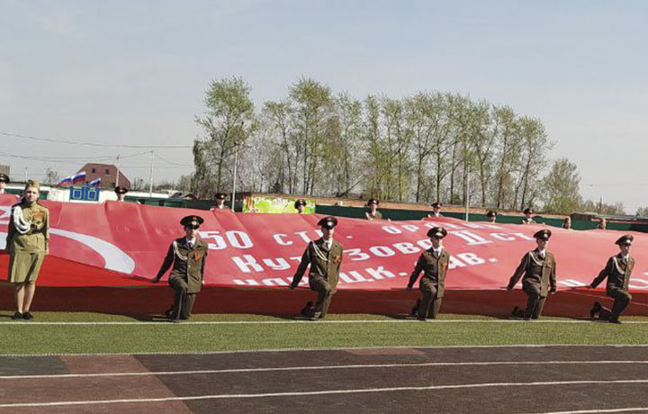 Участники мероприятия — судьи и сотрудники аппарата Суворовского межрайонного суда, учащиеся образовательных учреждений, воспитанники спортшколы развернули на стадионе 20 метровую копию Знамени Победы.
