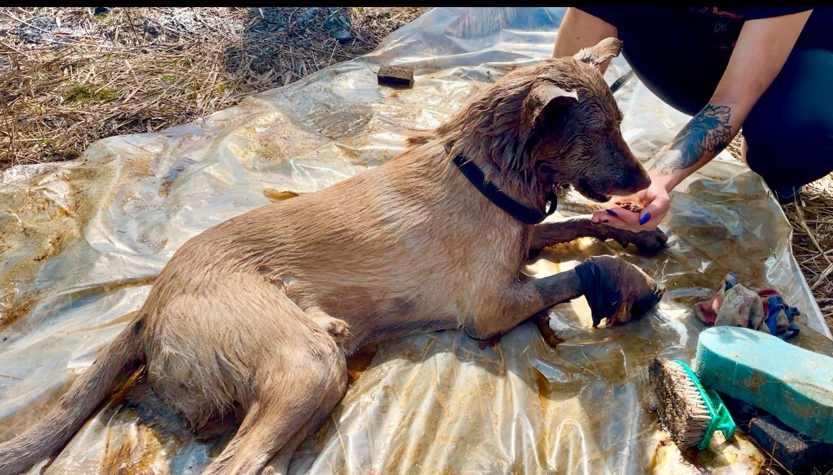 Несколько часов спасенного пса отмывали с помощью растительного масла и моющих средств, отпаивали водой и сорбентами. После чего его покормили и отвезли в ветклинику на лечение.