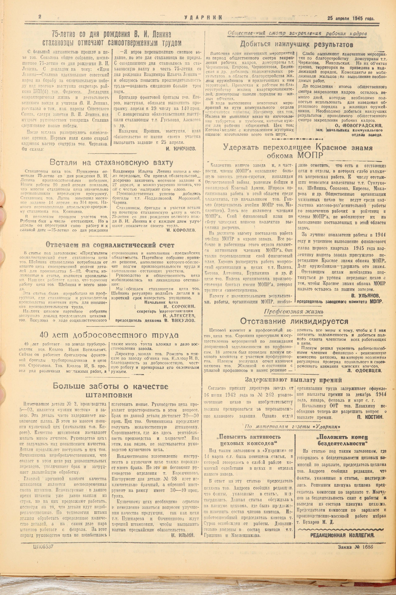 «<…> – Я втрое перевыполняю сменное задание, но это для стахановца не предел. С сегодняшнего дня становлюсь на стахановскую вахту в честь 75-летия со дня рождения Владимира Ильича Ленина – обязуюсь повысить производительность труда – подавать ежедневно больше трех норм.Бригадир фронтовой бригады тов. Егоров, выступая, обязался выполнить программу апреля к 29 числу на 140 проц.