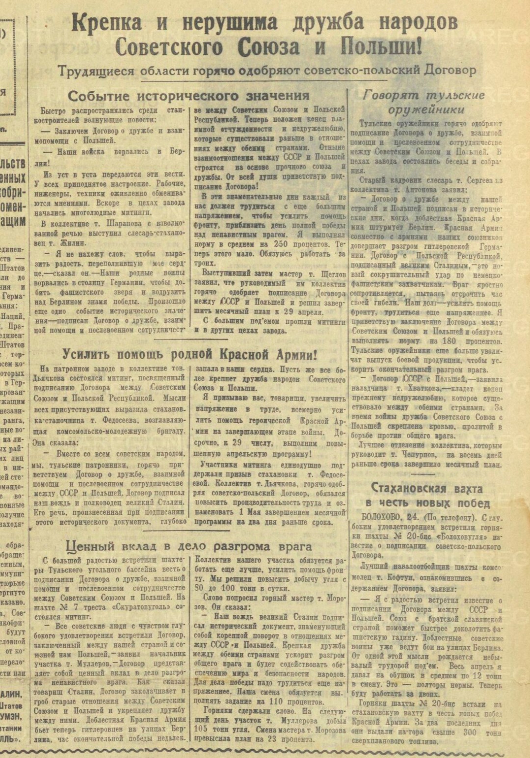 Ответная реакция на подписанный 21 апреля 1945 года договор о дружбе между СССР и Польшей не заставила себя долго ждать. Туляки одобряют такое решение – по этому случаю в газете «Коммунар»* от 25 апреля выделено достаточно места на развороте для статей с заголовками: «Событие исторического значения», «Ценный вклад в дело разгрома врага», «Говорят тульские оружейники».
