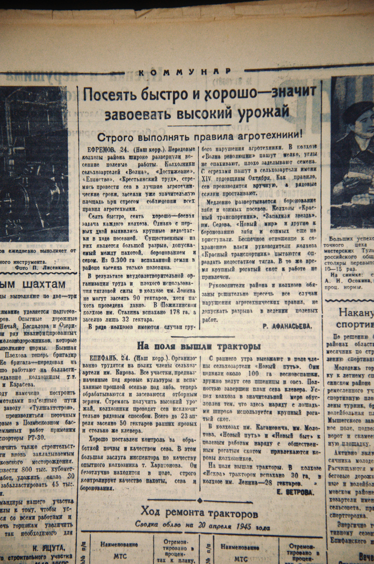 «Колхозники сельхозартелей «Волна», «Достижение», «Единство», «Крестьянский труд», стремясь провести сев в лучшие агротехнические сроки, засеяли уже значительную площадь при строгом соблюдении всех правил агротехники.<…> Однако с первых дней выявились крупные недостатки в ходе посевной. Существенным из них является большой разрыв, допускаемый между пахотой, боронованием и севом. Из 3.000 га вспаханной земли в районе засеяна только половина.