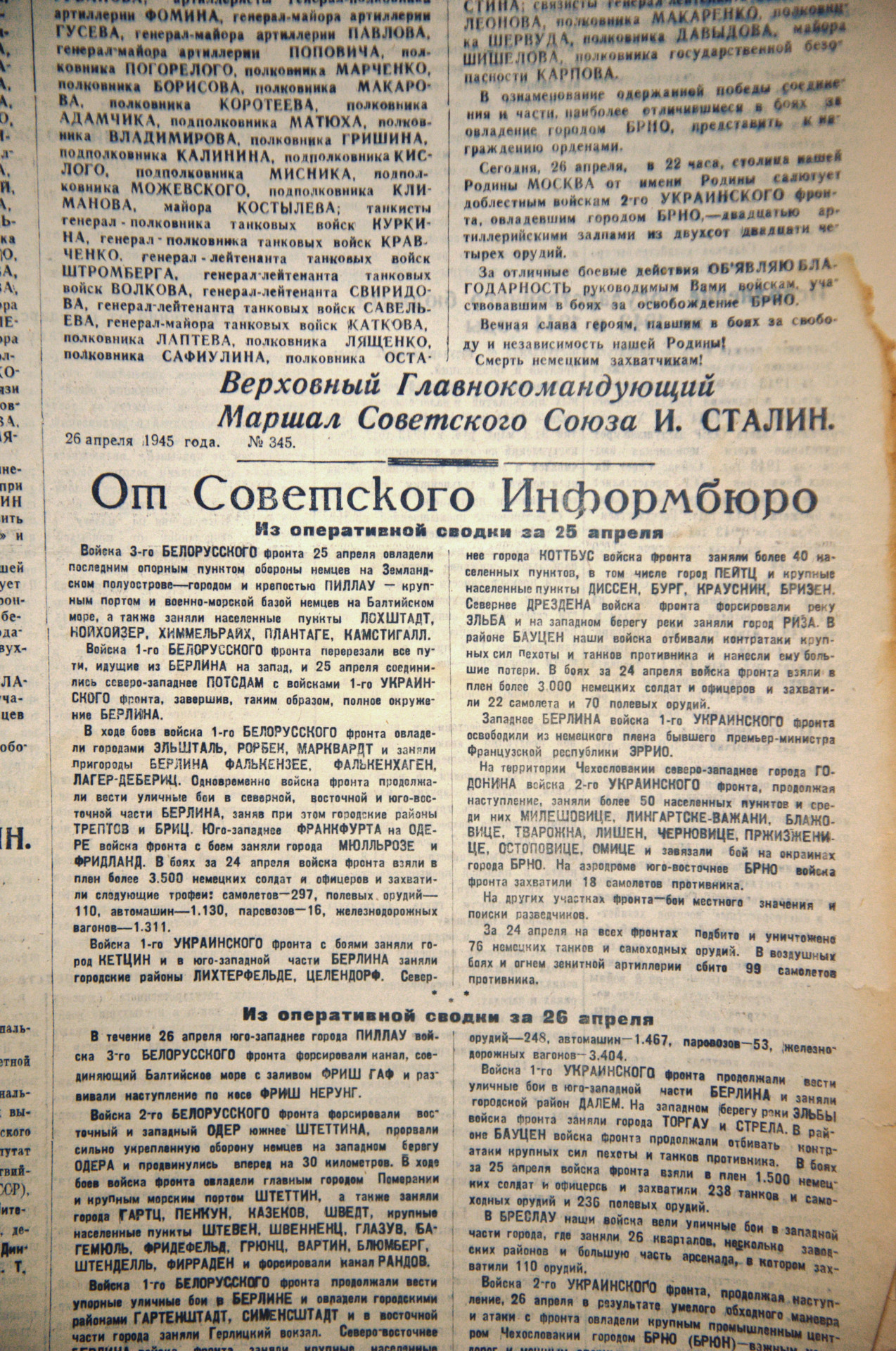 Советские войска продолжают продвигаться вглубь Германии и овладевать различными городами. Также в это время уже идут уличные бои в немецкой столице – Берлине. Новые успехи Красной Армии описаны в заметке «Из оперативной сводки на 25 апреля» в том же выпуске газеты «Коммунар».