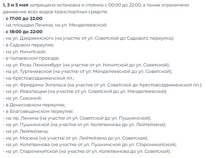 Накануне нам стало известно, что 1 мая в городе также будет действовать ограничение на движение транспорта в Оружейном переулке и у сквера Тулякам-героям.