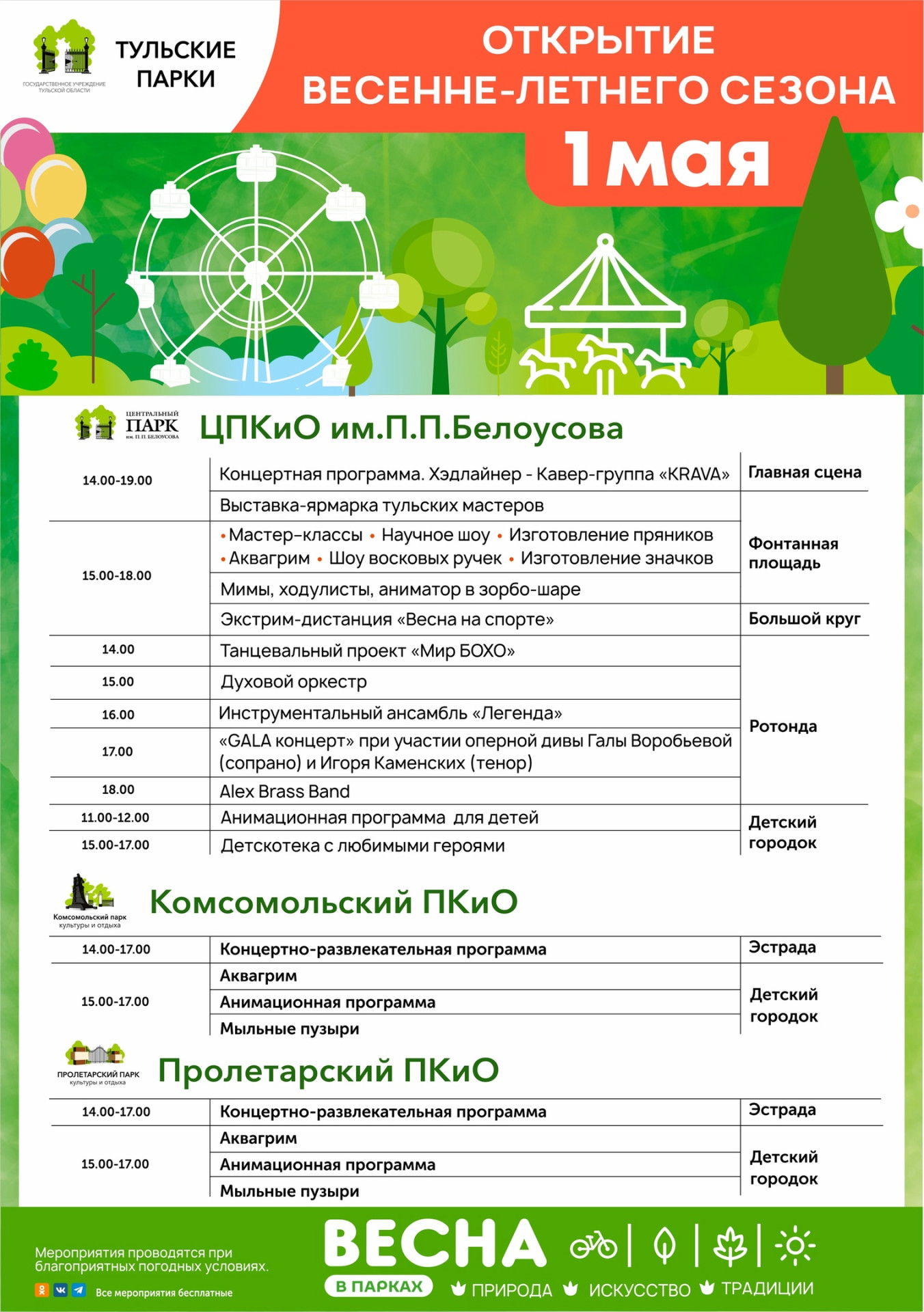 Весенне-летний сезон в тульских парках 0+, «Мир. Труд. Добродей» 0+ в ремесленном дворе и различные мастер-классы. Куда можно сходить в Туле с 1 по 4 мая, смотрите в афише ТСН24.