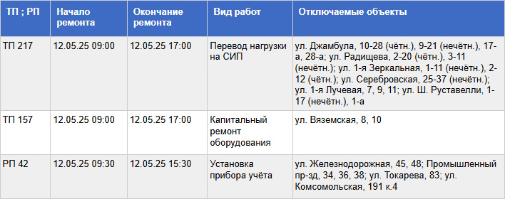 Так, без света 5 мая останутся некоторые дома по улицам Серебровская, Токарева, Радищева, Комсомольская, Вяземская, 1-я Лучевая, Железнодорожная и другим. Полный список адресов и график отключения: