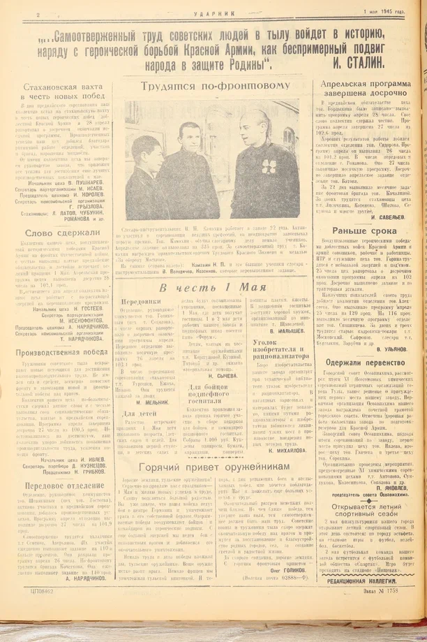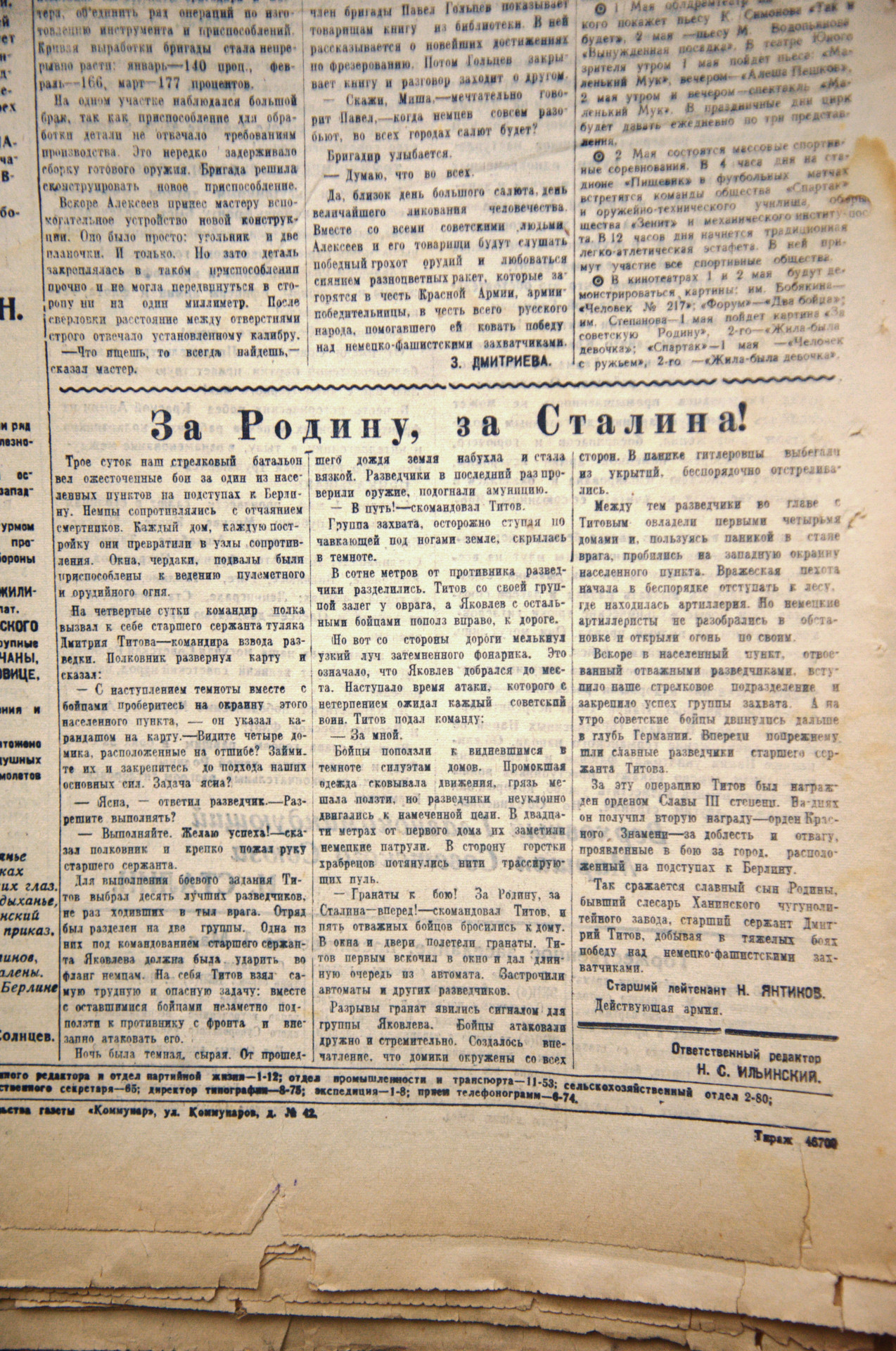 1 мая 1945 года бои ведутся уже не на территории Советского Союза, а в Германии, в том числе в столице – Берлине. Мотивация на победу огромная – необходимо отстоять право своей родины и союзных государств на независимость. Подвиги героев активно публикуются в тульской периодике. Например, в газете «Коммунар»* от 1 мая мы видим статью «За Родину, за Сталина!», где рассказывается о важных стратегических шагах стрелкового батальона, в числе которого были наши земляки.