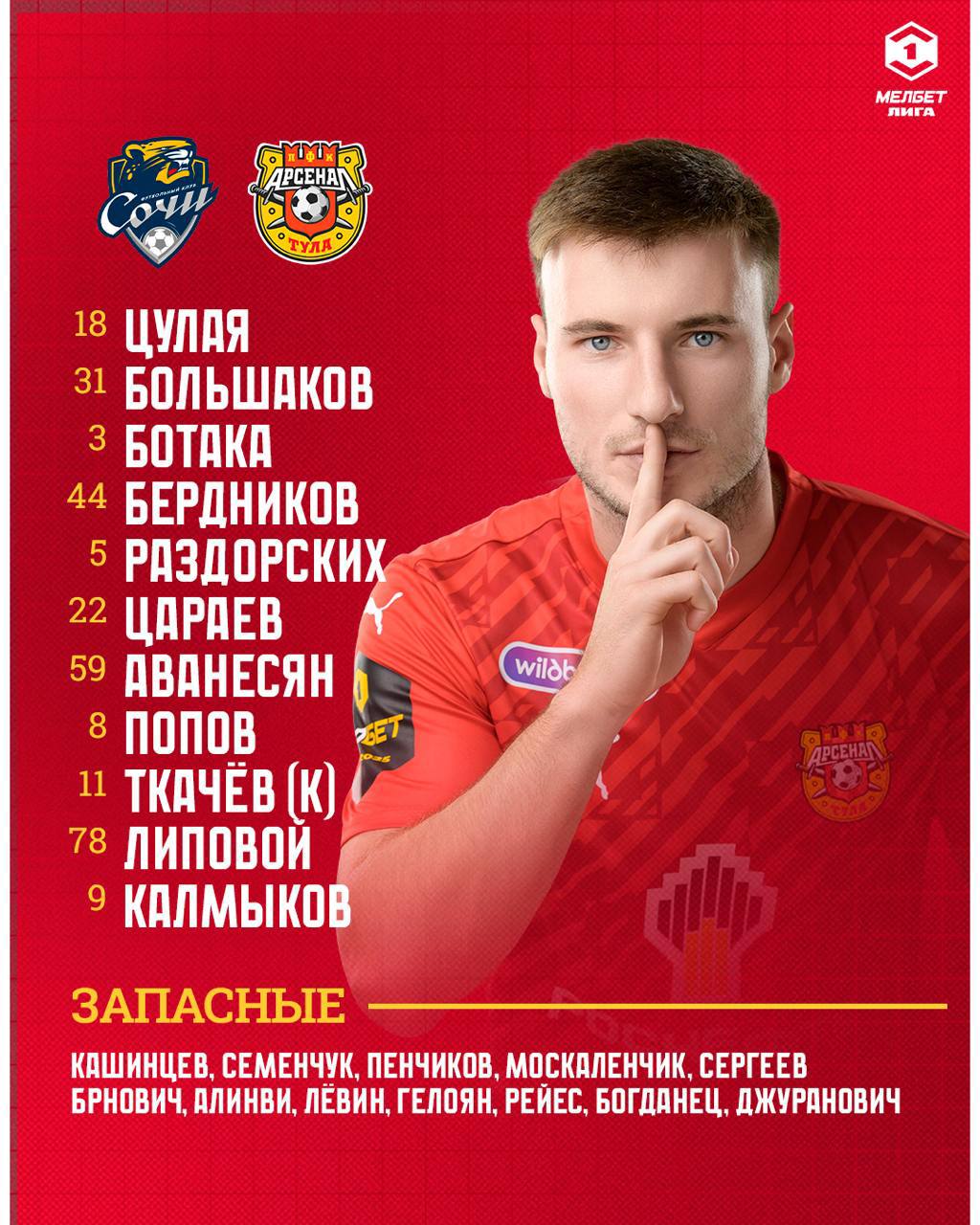 Опубликован состав тульского «Арсенала» в матче с «Сочи»