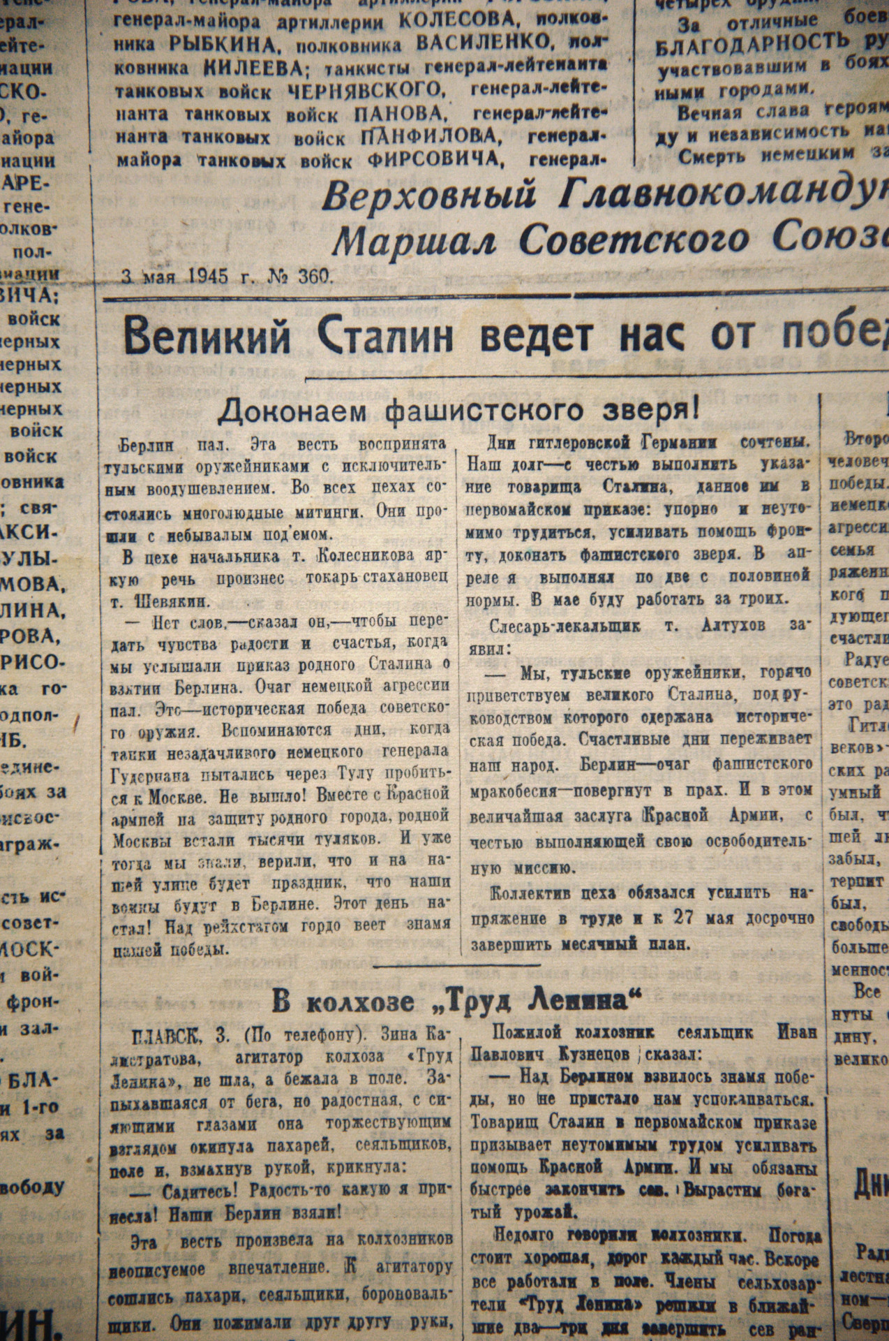 Красная Армия выполнила свой долг перед Отечеством – Берлин повержен, и победа ожидается со дня на день. Однако это вовсе не означает, что можно расслабляться. Тыл настроен на то, чтобы работать более самоотверженно, ведь теперь их задача уже не способствовать победе, а восстанавливать пораженную долгой войной страну. Об этом статья «Доконаем фашистского зверя», опубликованная в газете «Коммунар»* от 4 мая 1945 года.
