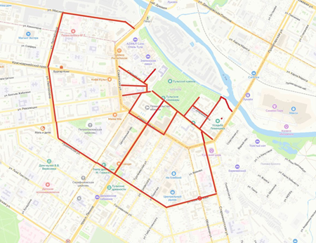 - На Крестовоздвиженской площади, по ул. Фридриха Энгельса (от Крестовоздвиженской площади до ул. Советской), по ул. Революции (от ул. Советской до ул. Менделеевской), по ул. Союзной, а также в Денисовском и Благовещенском переулках.