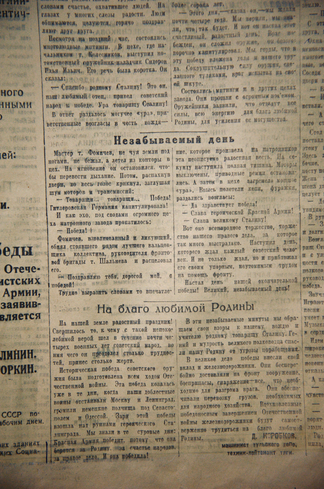 «Мастер т. Фомичев, не чуя земли под ногами, не бежал, а летел из конторы в цех. На мгновение он остановился, чтобы перевести дыхание. Потом, распахнув двери, во весь голос крикнул, заглушая шум моторов и трансмиссий:– Товарищи… Товарищи… Победа! Гитлеровская Германия капитулировала!