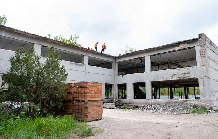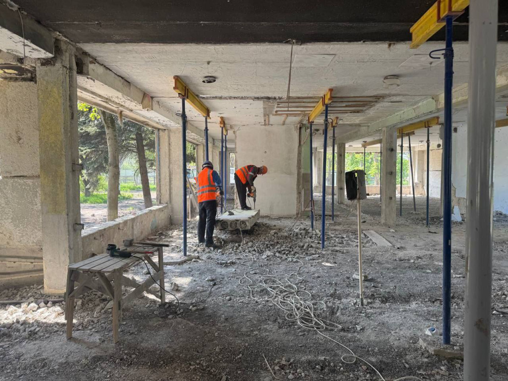 Здесь ведется демонтаж вентиляционных шахт и кровли, очистка плиты от старой штукатурки и прилегающей территории от мусора. Также вырублены аварийные деревья, смонтирован строительный городок, проведены геологические и геодезические изыскания.