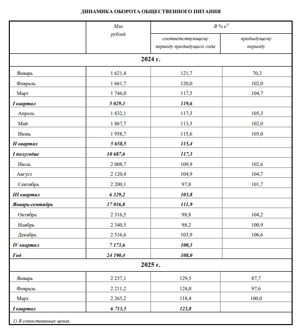 Все три месяца 2025 года оборот общепита превышает два миллиарда рублей.