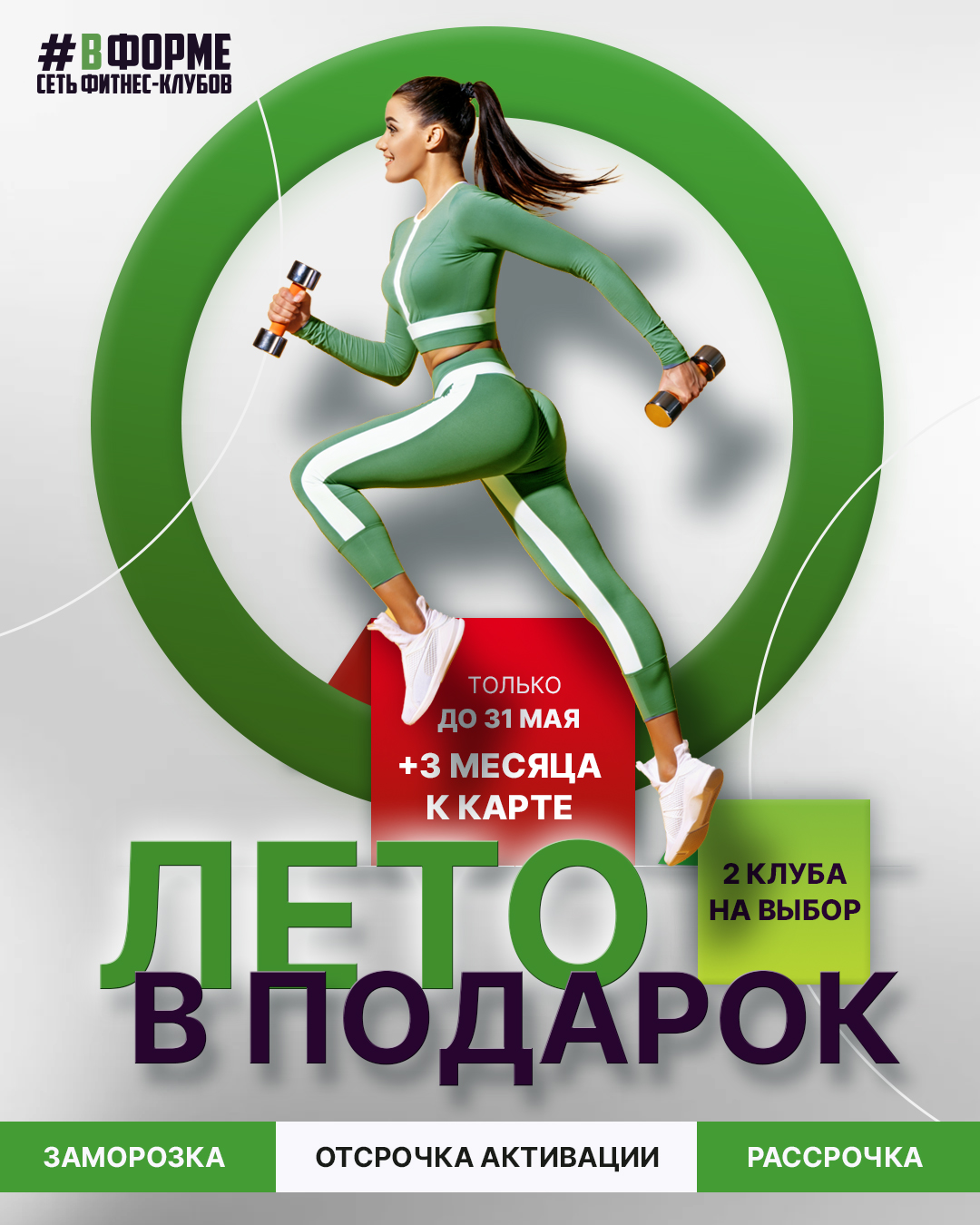 Для получения выгоды необходимо обратиться в фитнес-клуб #ВФОРМЕ до 31 мая. Владельцам абонементов предлагают до 60 дней заморозки – пропускать можно без потерь, а также активацию в течение 90 дней (для тех кто собирается в отпуск, дачный сезон или не готов начать заниматься сейчас) и два клуба на выбор! Тренироваться можно там, где удобно.