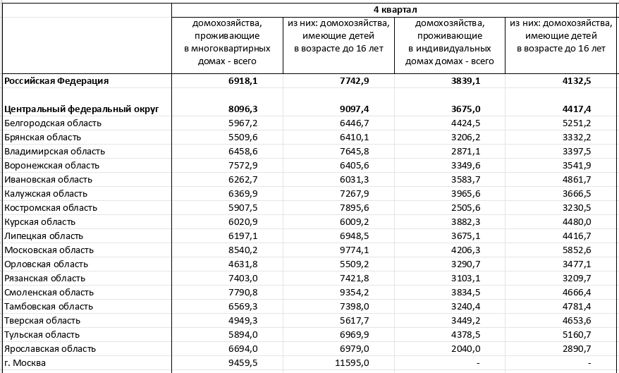 Данные указаны по итогам четвертого квартала года. В первом суммы были значительно выше. Например, для домохозяйства в МКД без детей – 6 296.