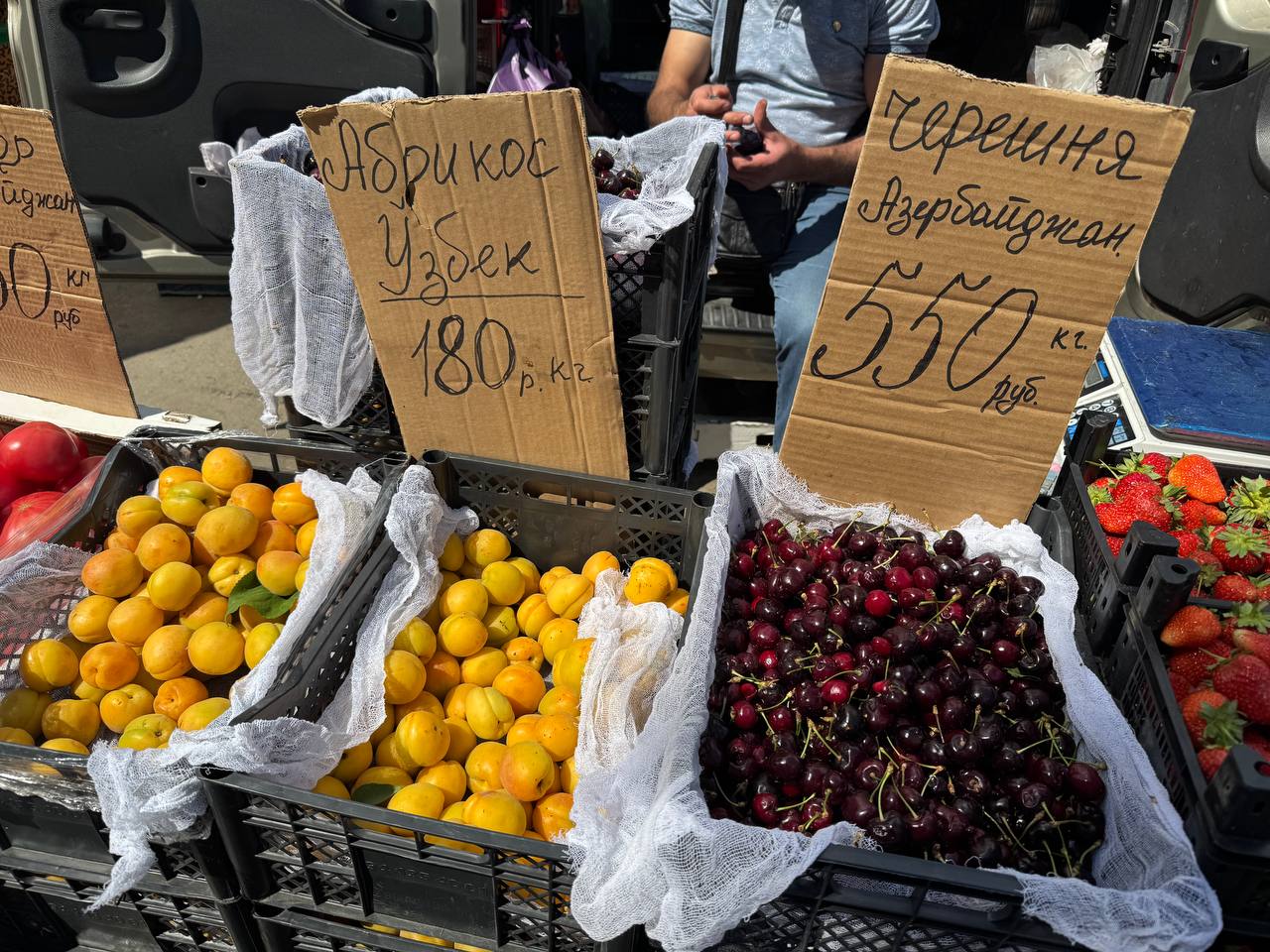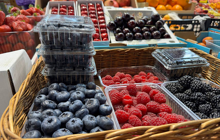 На рынке «Салют» цены на ягоды также кусаются. Клубника от 600 рублей и выше, голубика — 1800 и 2000 рублей за килограмм, черешня — от 700 рублей за килограмм.