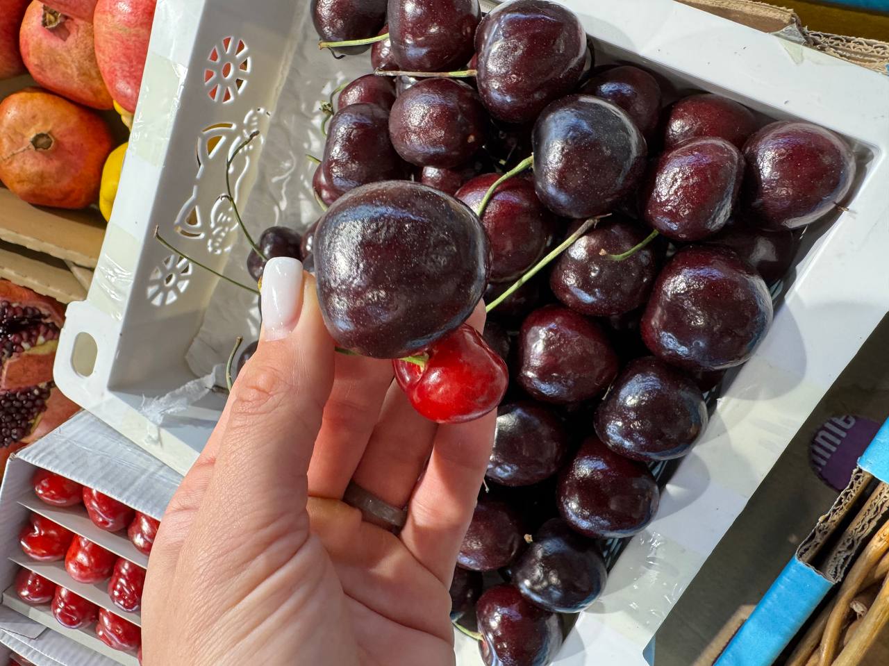 Еще можно встретить импортный товар. Например, черешню по размеру трёх отечественных. Цена на такую ягоду, конечно, соответствующая — 3200 рублей за килограмм.