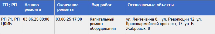 Так, отключение света коснется некоторых домов по улицам Революции, Братьев Жабровых, Красноармейскому проспекту и улице Лейтейзена.