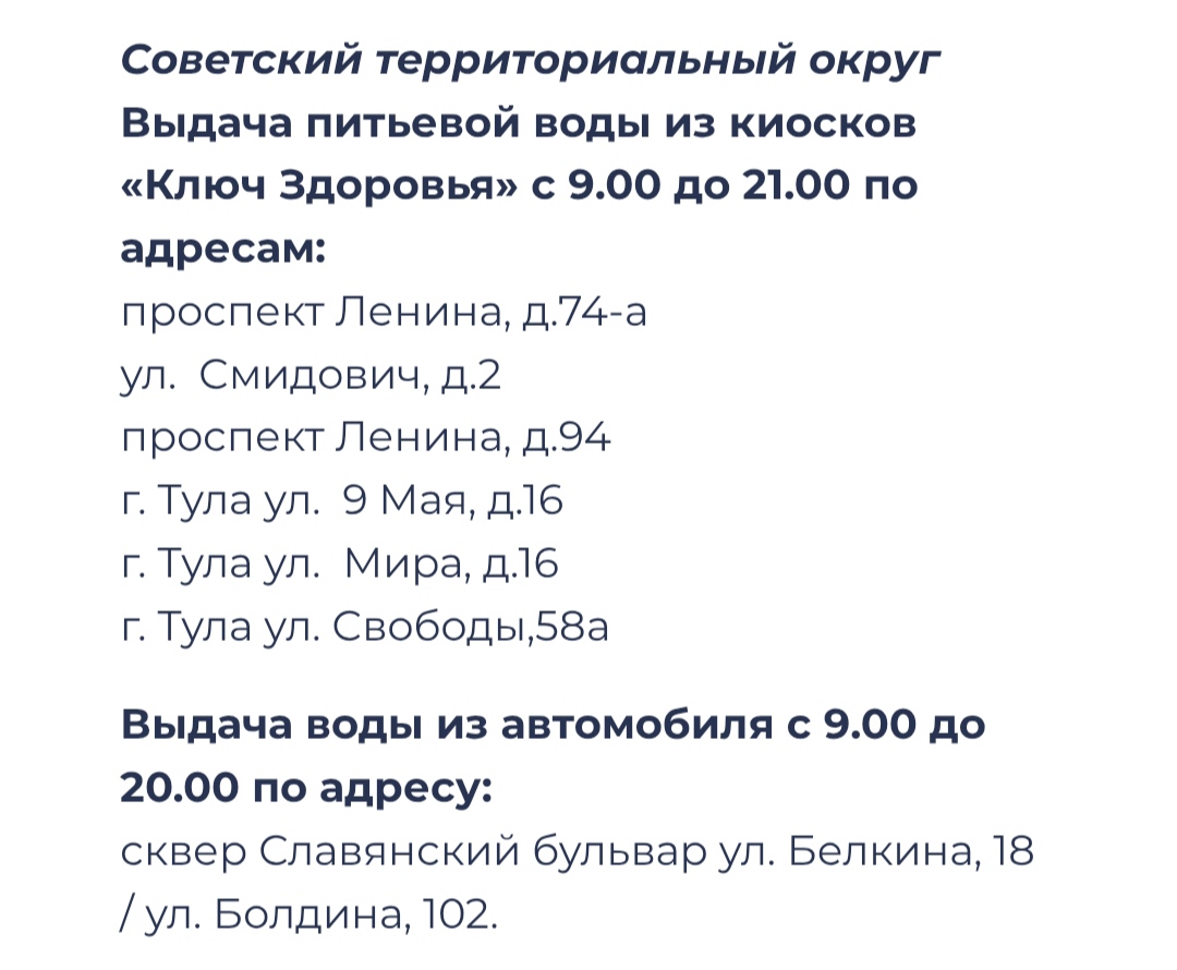 Для жителей в течение дня 4 июня будет организована бесплатная раздача воды. Об этом туляков информирует горадминистрация.